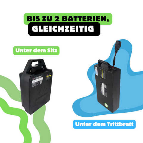 Unser Citycoco HM-7 bietet jetzt die Möglichkeit, mit zwei Batterien gleichzeitig ausgestattet zu werden und so seine Autonomie für noch längere Fahrten zu verdoppeln. Der erste Akku passt problemlos unter den Sitz, während der zweite in der Trittstufe Platz findet. Diese geniale Konfiguration maximiert die Energiekapazität Ihres Citycoco HM-7, ohne das elegante Design und die Praktikabilität zu beeinträchtigen.